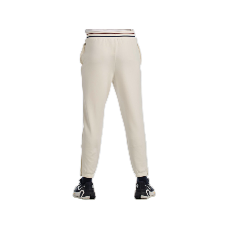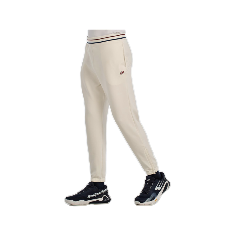 Pantalon blanc cassé de la marque Bullpadel, confectionné avec des fils Repreve, en tissu jacquard brossé avec intérieur en polyester recyclé et élasthanne. Il est doté de poches latérales zippées, d'un ourlet élastique zippé, d'une taille côtelée tricolore avec cordon de serrage, d'un ourlet estampé à chaud et d'un logo brodé sur le devant. Idéal pour rester au chaud que ce soit pour vos entrainements ou compétitions.