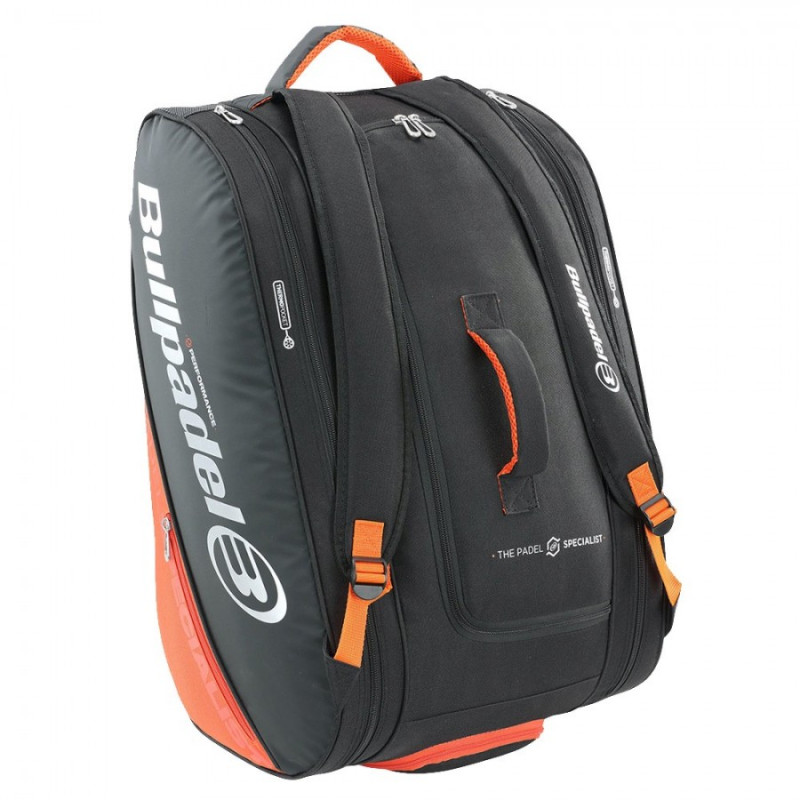 En plus, il a deux compartiments thermo avec une capacité de quatre raquettes, il a un compartiment séparé et ventilé pour les vêtements et les chaussures, il a une petite poche latérale extérieure et une poignée supérieure.